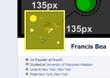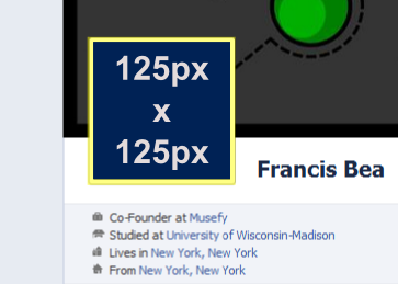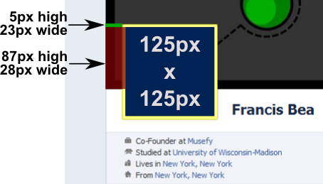 Here what you should recognize is that the Porfile Picture, represented in blue, is 125px by 125px. A white 5 px wide frame borders the Profile Picture, but for designing purposes we will imagine that the Profile Picture was superimposed and centered on a larger 135px by 135px box represented here in yellow.